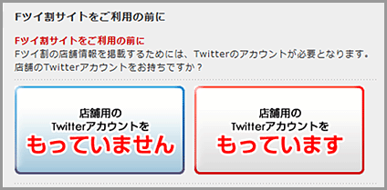 F¥Ä¥¤³ä¥µ¥¤¥È¤ò¤´ÍøÍѤÎÁ°¤Ë¤È¤¤¤¦¤³¤È¤Ç¡¢F¥Ä¥¤³ä¥µ¥¤¥È¤ò¤´ÍøÍѤˤʤë¾ì¹ç¡¢Twitter¥¢¥«¥¦¥ó¥È¤¬É¬ÍפȤʤê¤Þ¤¹¡£Å¹ÊÞ¤ÎTwitter¥¢¥«¥¦¥ó¥È¤ò¤ª»ý¤Á¤ÎÊý¤Ï±¦Â¦¤Î¡ÖŹÊÞÍѤÎTwitter¥¢¥«¥¦¥ó¥È¤ò¤â¤Ã¤Æ¤¤¤Þ¤¹¡×¥Ü¥¿¥ó¤ò²¡¤·¤Æ¤¯¤À¤µ¤¤¡£